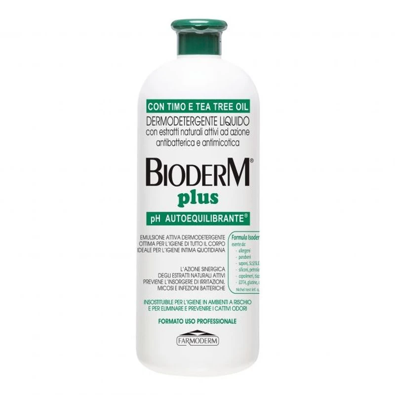 BIODERM plus è una emulsione detergente arricchita con timo e tea tree oil noti per le loro proprietà antibatteriche ed antimicotiche ideale per l’igiene di tutto il corpo e per l’igiene intima quotidiana. Oltre ad assicurare una perfetta igiene naturale, previene il possibile insorgere di irritazioni, infezioni batteriche e micosi e svolge una benefica azione decongestionante, favorendo il ripristino dei diversi pH alterati e la ricostruzione delle naturali barriere dermoprotettive.